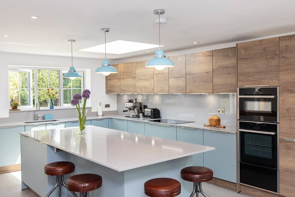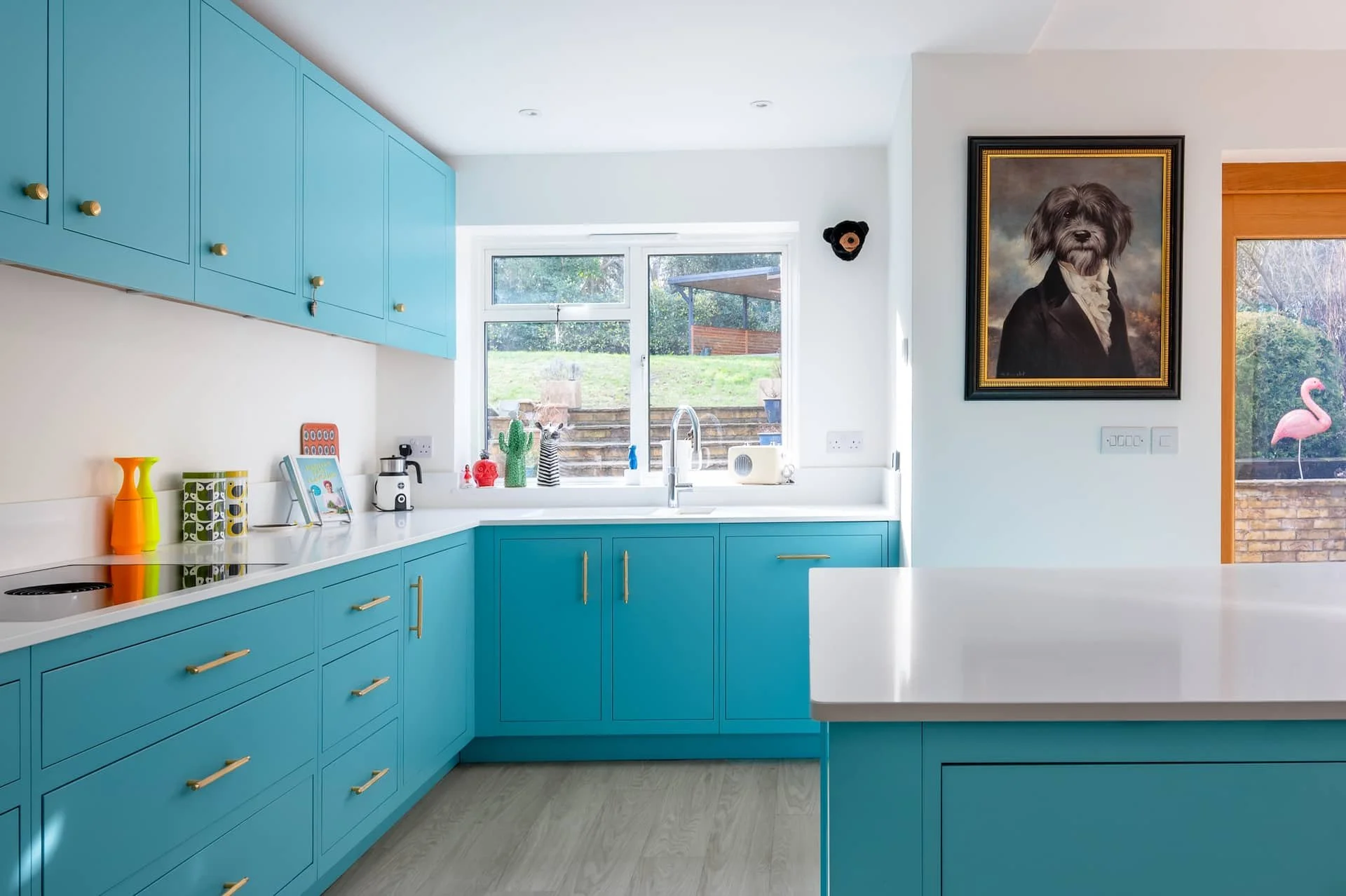 Turquoise blue kitchens are a fantastic choice for those who favour a bolder, more dramatic look. This project in Bernards Heath combines bright blue in-frame cabinetry with a bright white quartz worktop for an awe-inspiring look.