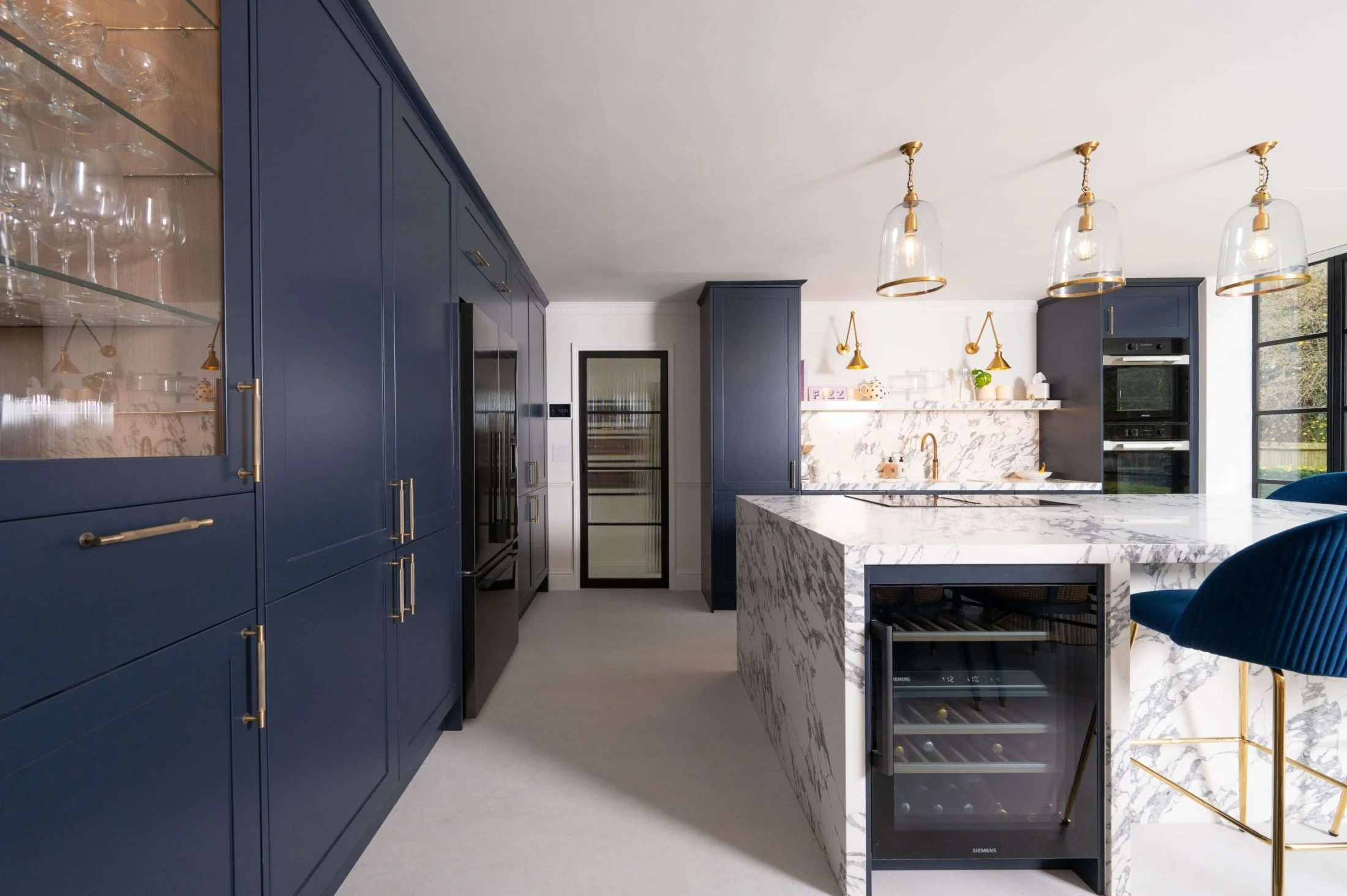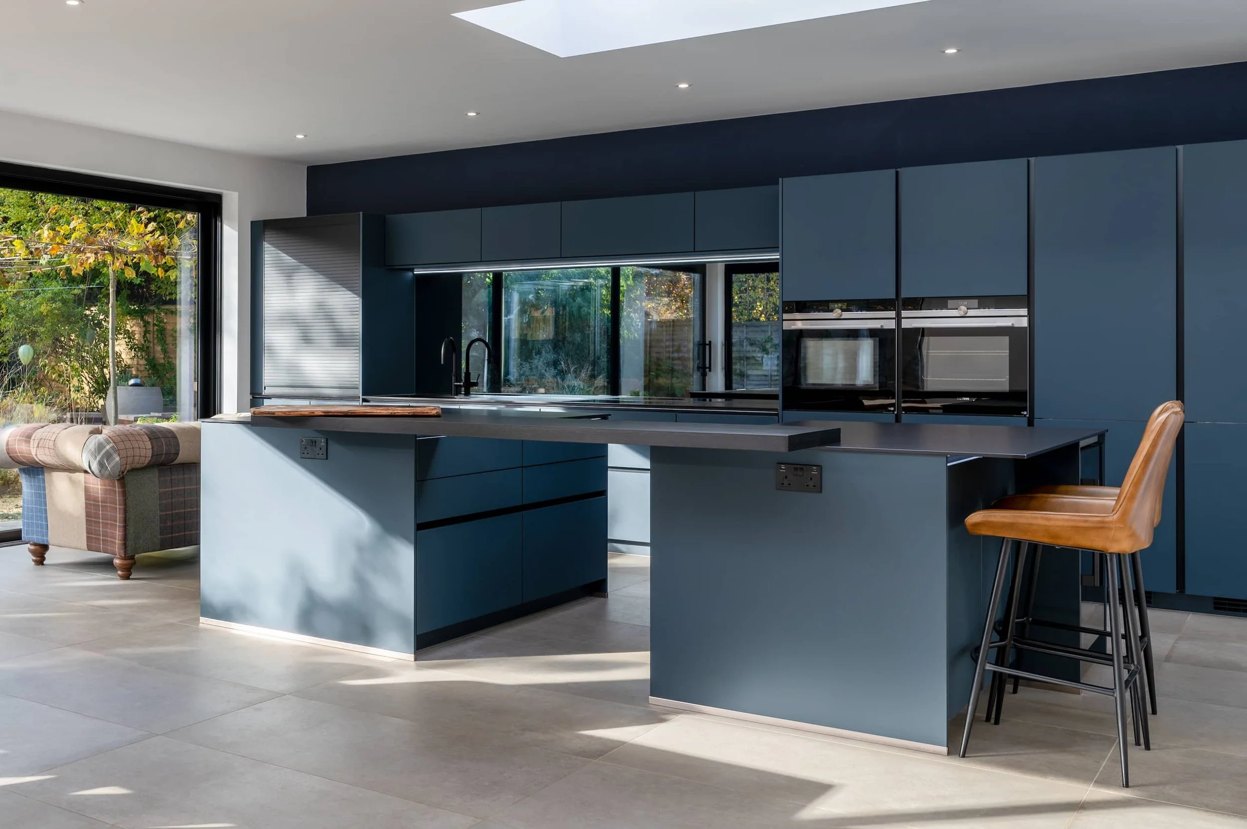 This Harpenden kitchen project demonstrates how matt blue tones can create a calming yet fresh atmosphere, perfect for open-plan spaces. Paired with sleek cabinetry and clean lines, this blue handleless kitchen is ideal for anyone seeking a unique yet understated aesthetic.