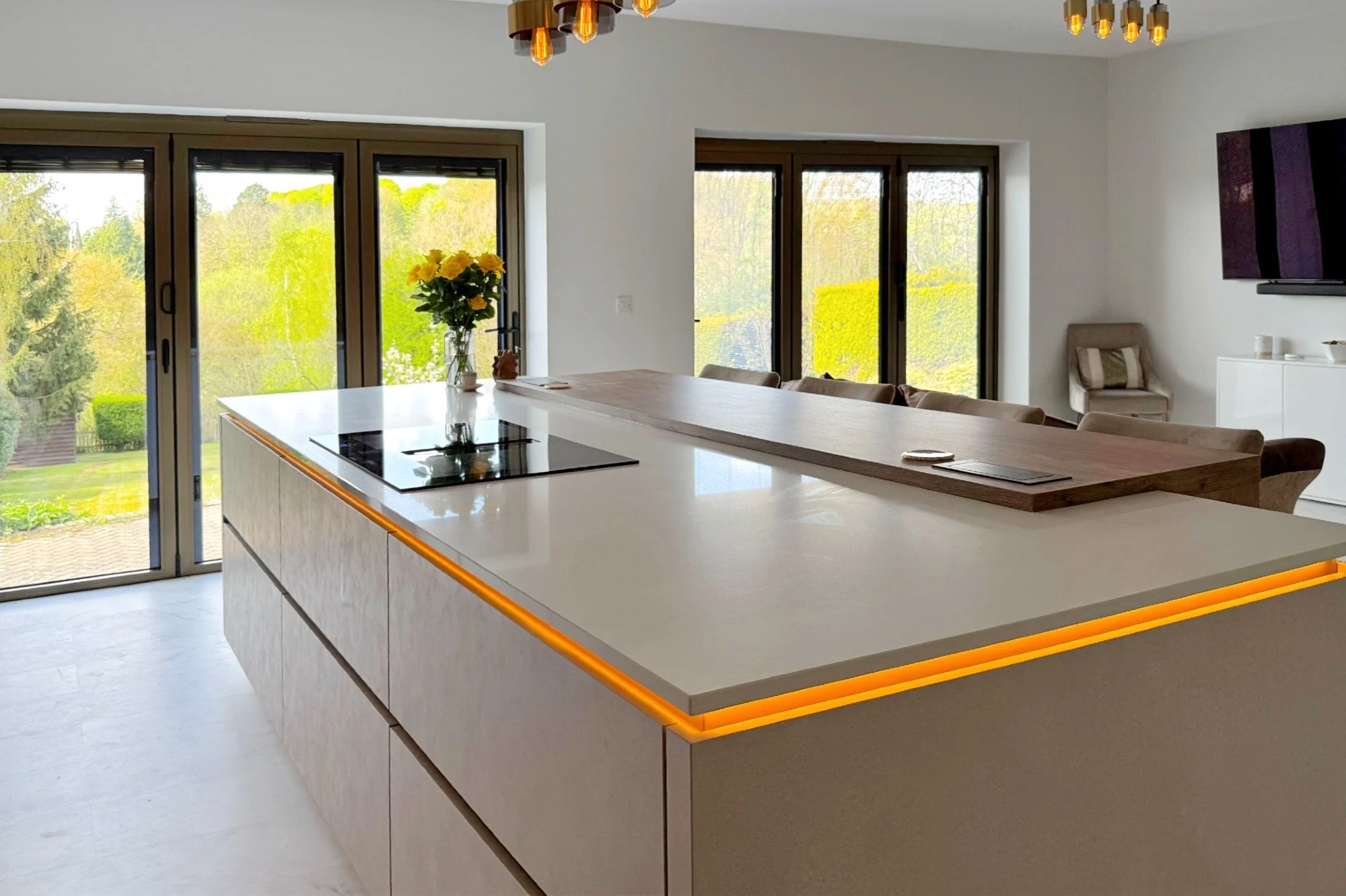 The look is completed with Blanco Snow Quartz worktops by Algarve Granite and a bronze mirror glass splashback, subtly reflecting light and adding a touch of luxury.