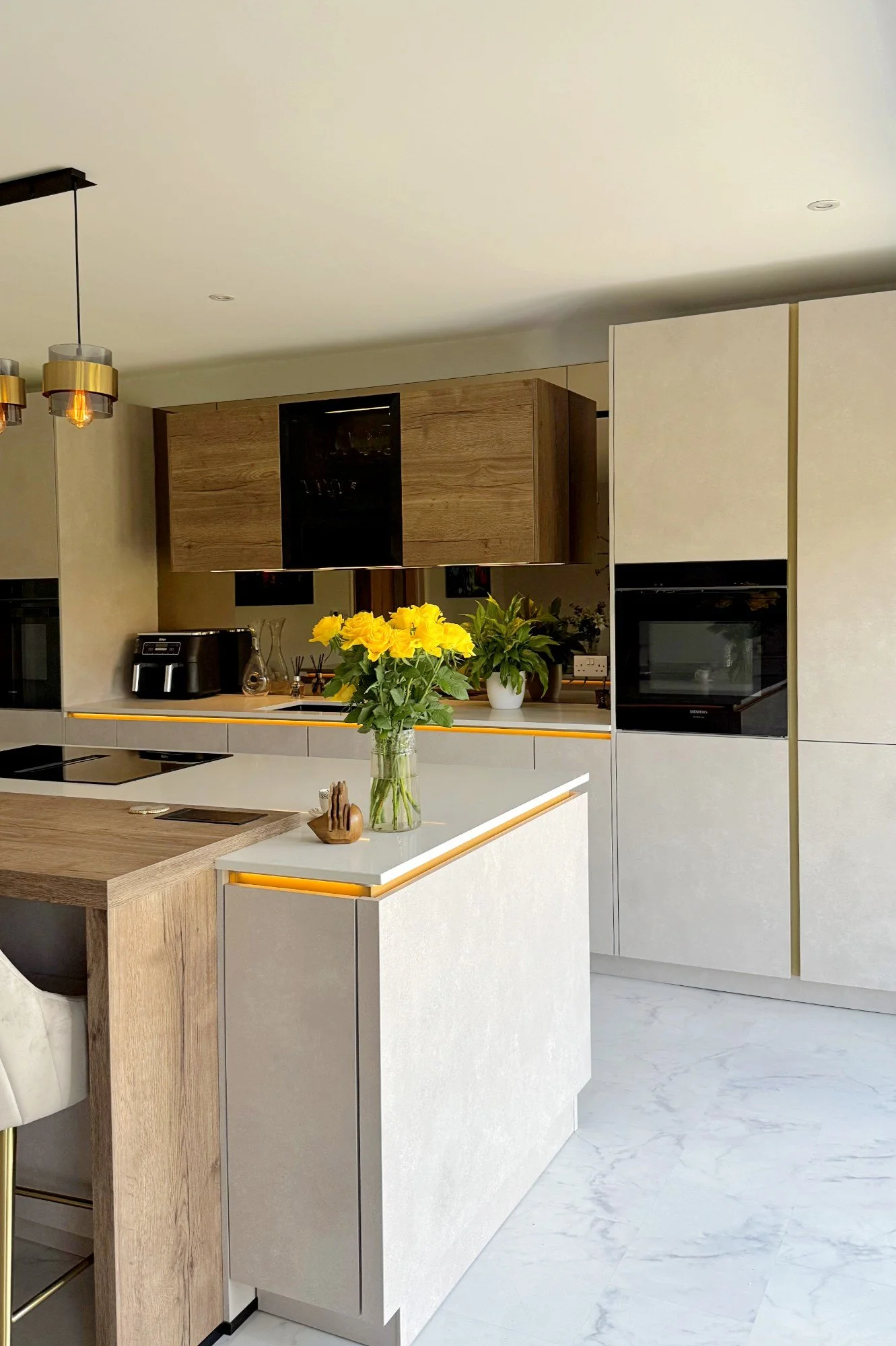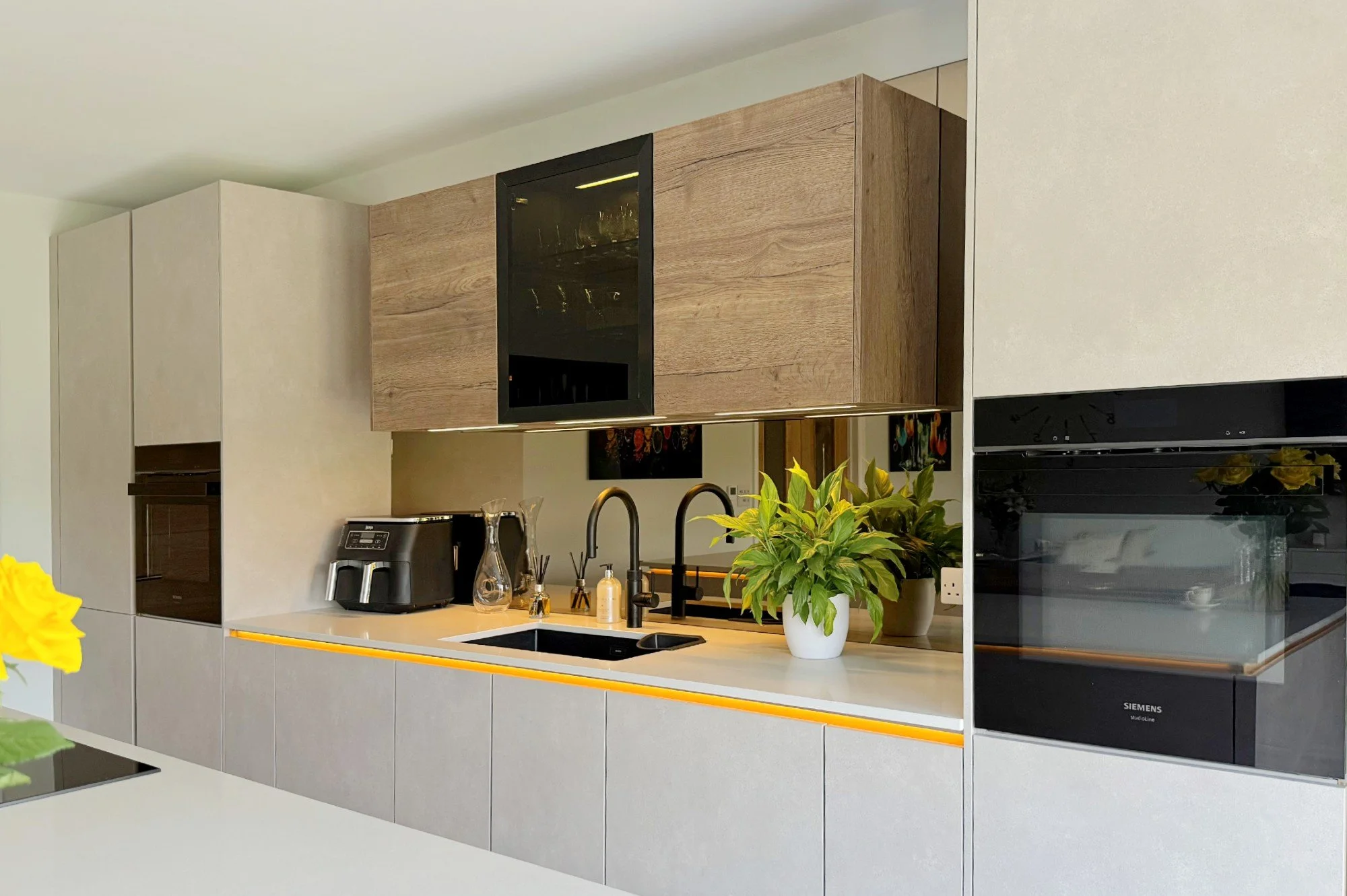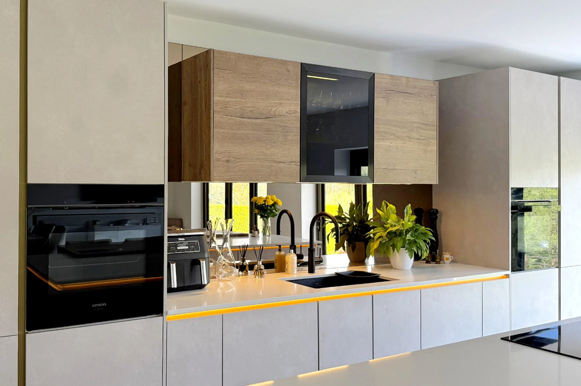 Our handleless cabinetry finished in Sand Concrete sets an elegant yet minimalist tone, while the overhead units in Havana Oak add a layer of warmth and texture. A gold rail runs along the top of the cabinetry, creating a sleek integrated grip that maintains the handleless look.
