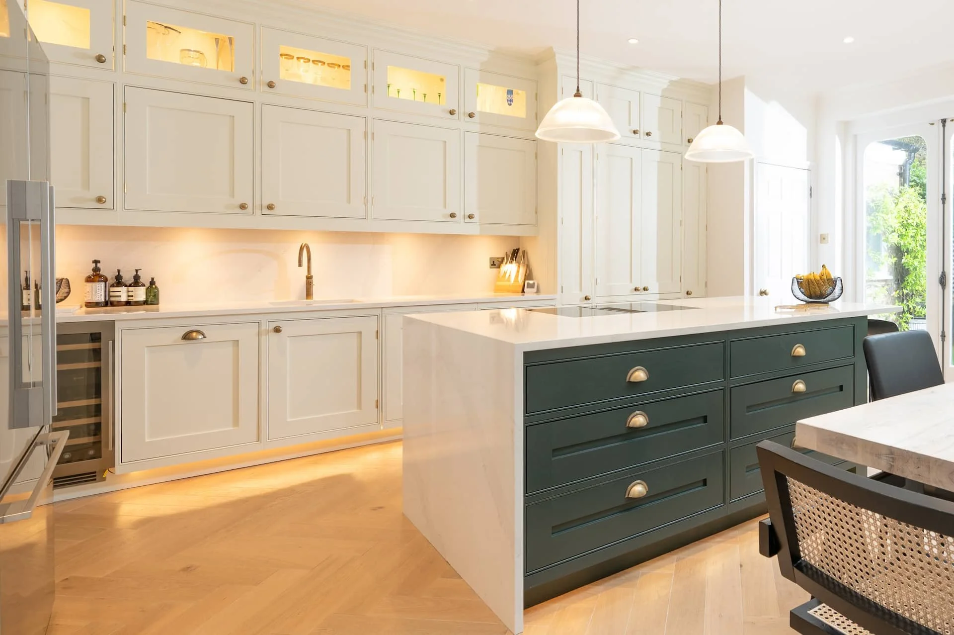 This elegant kitchen in Clapham features traditional white and green cabinetry with gold accents, making the perfect classic family kitchen with a modern twist.