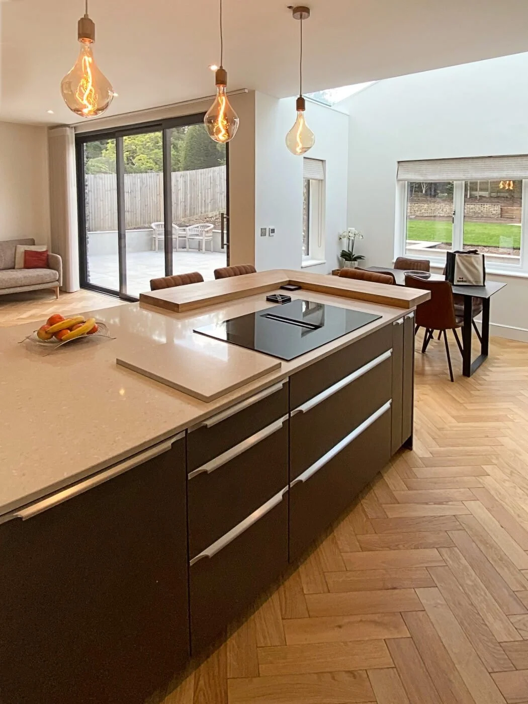 This modern kitchen in Radlett was designed as part of an extension, creating a bright, open-plan space that blends warm finishes with contemporary design.