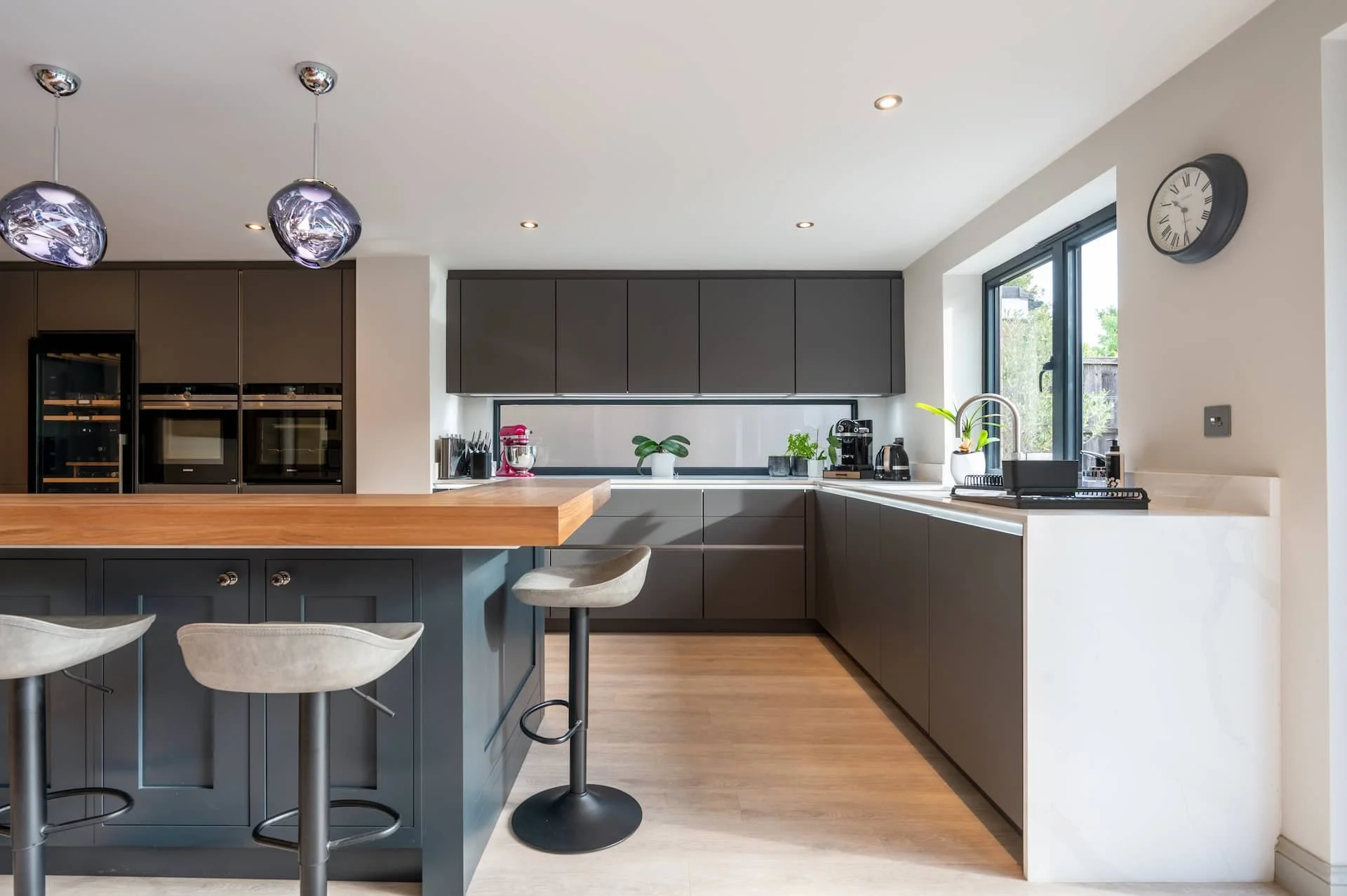 It starts with the cabinetry, a mix of Nobilia Touch kitchens in Slate Grey and Manor Dorchester in-frame kitchens in Off Black. This combination created a unique space with an elegant yet minimalist feel.