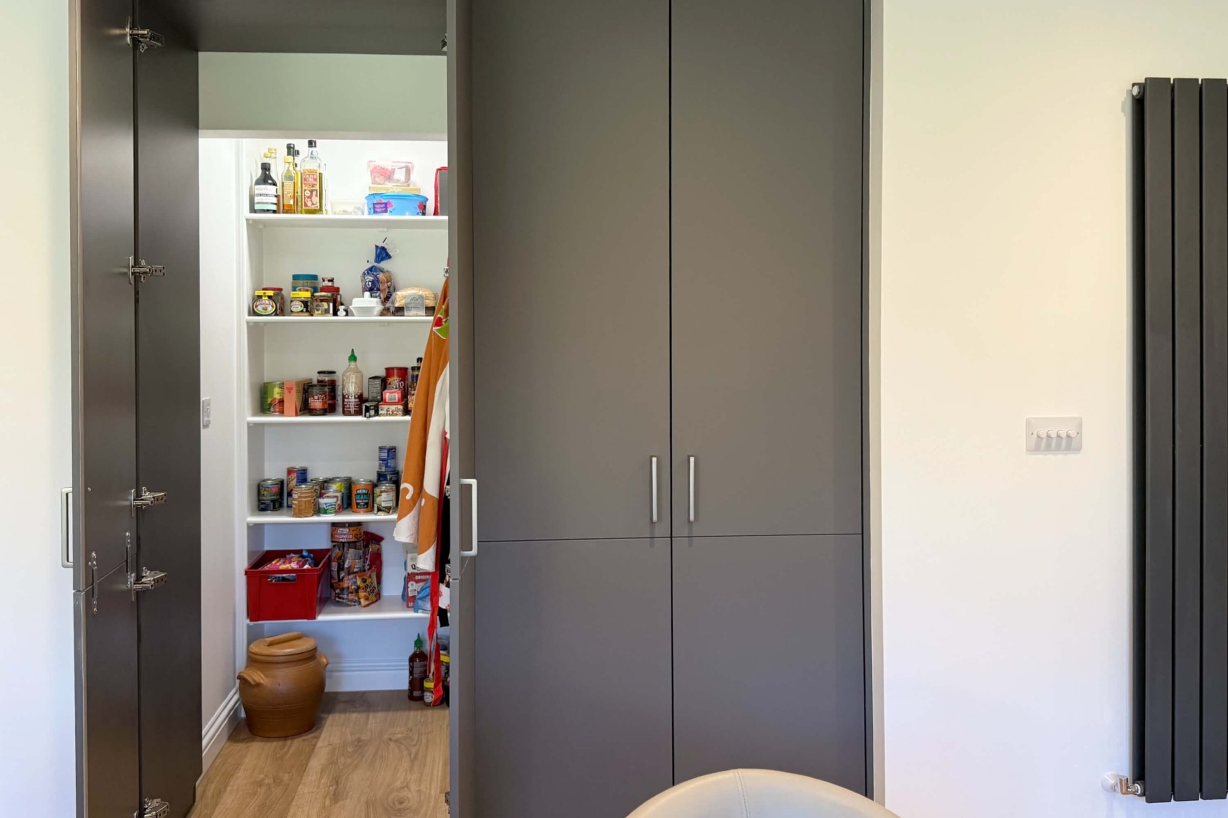 Worktops are Fusion White quartz, offering a crisp contrast to the darker cabinetry. Durable, bright and easy to maintain, the surface helps reflect light through the space while adding a refined touch to the overall scheme.